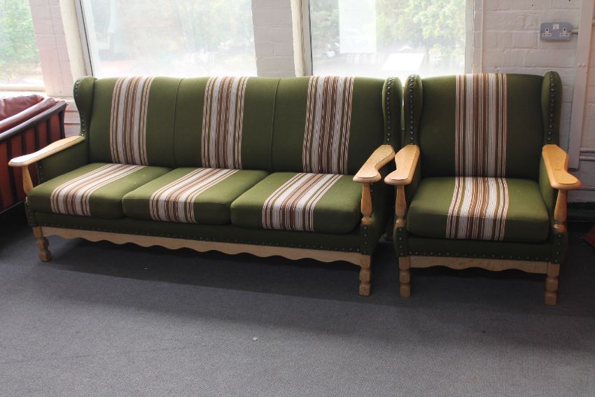 A blonde oak framed three seater settee and armchair in green striped fabric