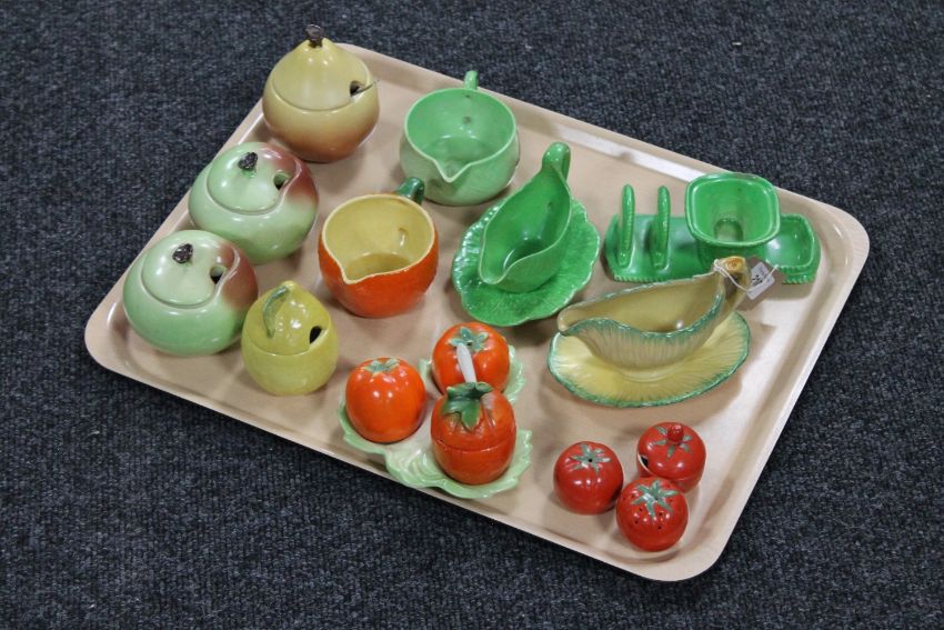 A tray of two three-piece tomato pottery cruet sets together with nine pieces of Carlton ware and Crown Ducal china including preserve pots, sauce dishes on stands, toast rack etc