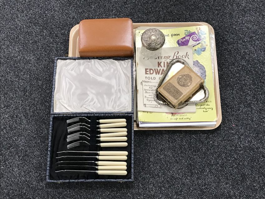 A tray of stainless steel cutlery, dressing table pot and plated tray, money box, three WWII era theatre scrap books, gent's travel set, signed Wimbledon programme etc, together with a vintage school anatomy poster