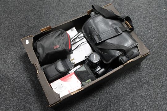 A box of assorted cameras to include a Canon EOS 1000F, Fujifilm Instant Camera, Olympus digital camera, together with a JVC video camera and a Bush portable DVD player