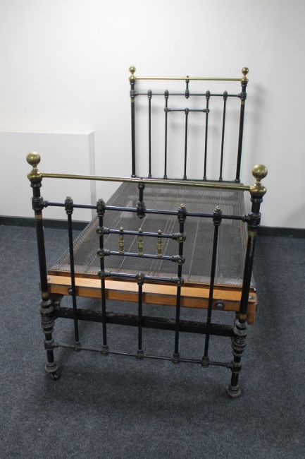 A Victorian cast iron and brass 3' bed frame with box spring