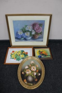 A still life pastel drawing signed B. N. Aitchison, together with three further still life oil paintings and watercolours