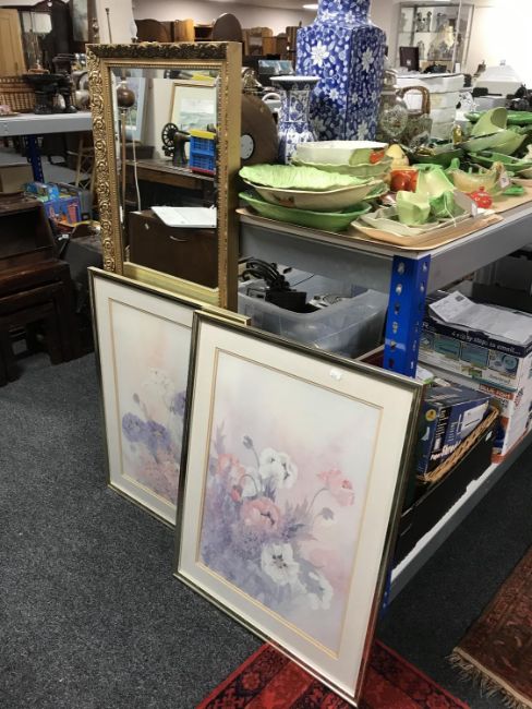 A gilt framed bevelled edge hall mirror together with two metal framed prints of flowers