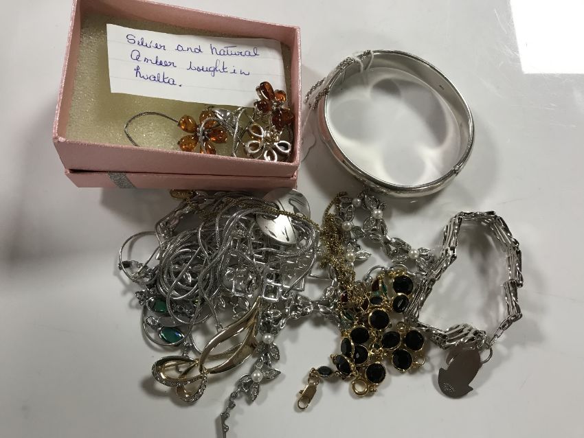 A silver bangle and gate bracelet together with white metal jewellery, costume necklace, amber set jewellery etc.