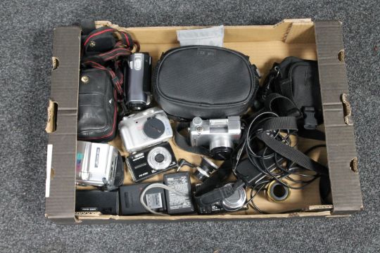 A box of 35mm digital cameras - Canon, Pentax, Nikon, Olympus