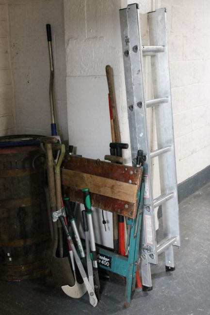 A set of extending aluminium ladders together with a folding black and decker work mate and quantity of tools