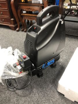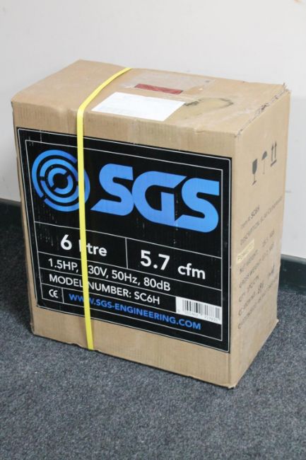 A boxed SGS 6 litre air compressor