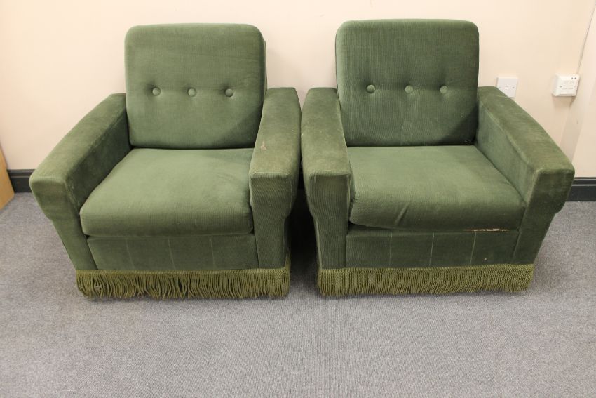 A pair of mid twentieth century armchairs upholstered in green dralon