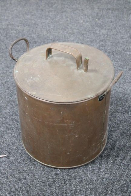 An antique copper lidded twin handled pot