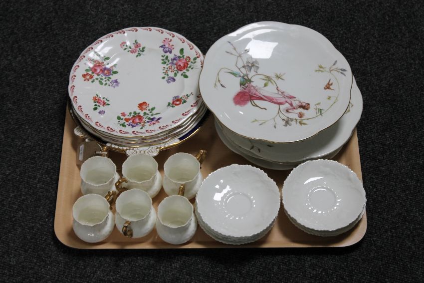 A tray of antique china to include four Royal Crown Derby floral plates, pair of Canida plates, part china eggshell tea service etc