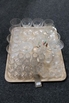 A tray of antique and later drinking glasses together with a set of eight glass bird cocktail sticks