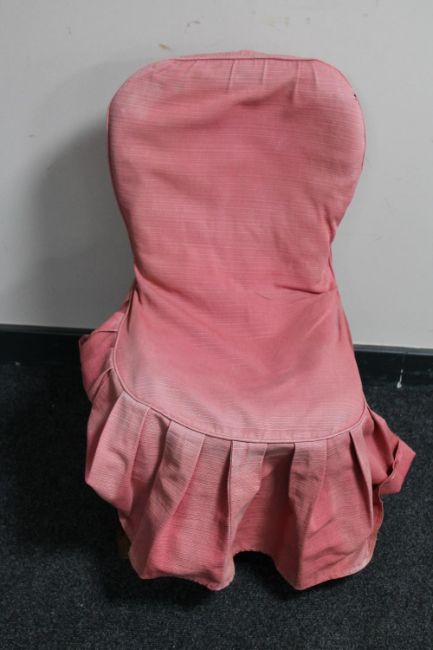 A Victorian bedroom chair with a pink loose cover