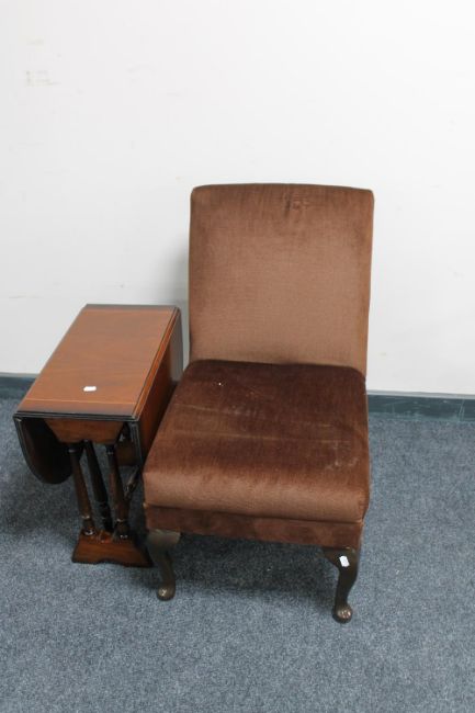 An inlaid mahogany flap sided table together with a bedroom chair upholstered in brown dralon