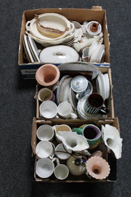 Three boxes of tureens, tea cups, Italian pottery vases, tea china etc