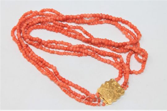 An antique triple strand coral necklace with high carat gold clasp
