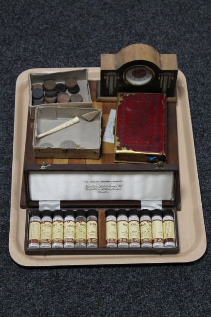 A tray of chess board and pieces, rose gold pendant on chain, Art Deco mantel clock, leather bound Holy Bible, etc and cased chemist's bottles