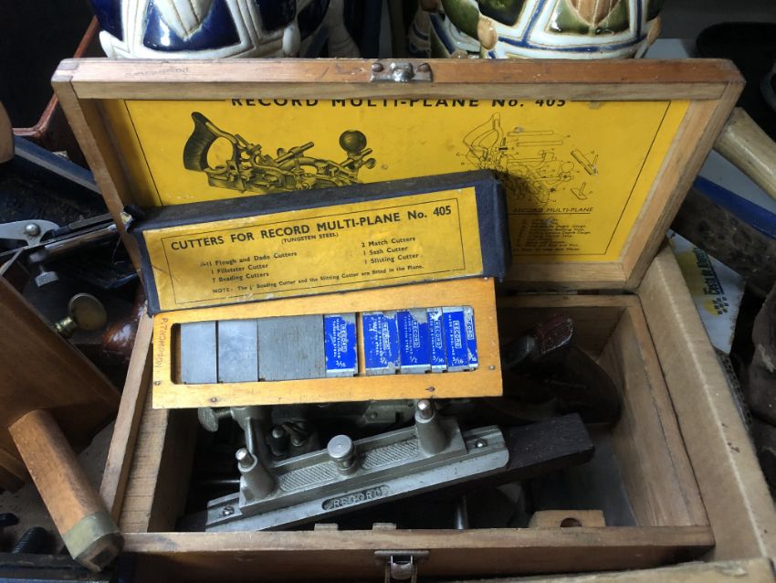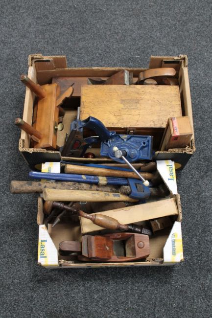 Two boxes of hand tools, wood working planes, record tools plane in wooden box, bench vice