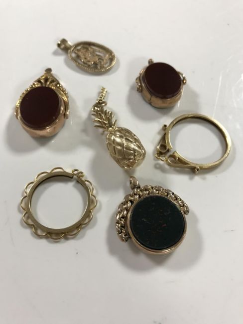A 14ct gold pendant modelled as a pineapple (7.4g), together with three gold mounted swivel fobs, a 9ct gold pendant (2.2g) and two yellow gold pendant mounts (2.8g).