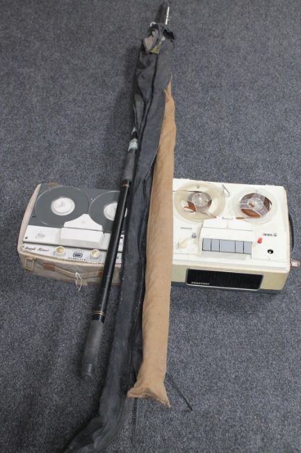 Two mid 20th century reel to reel players, two boat rods and a pick axe walking stick