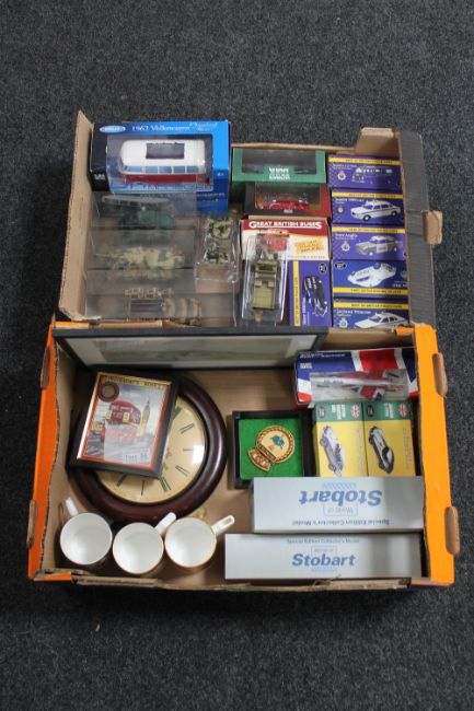 Two boxes of assorted die cast vehicles - Best of British police cars, Great British buses, Atlas fire engines, Eddie Stobart, a framed pictures, John Smiths wall clock and china mugs