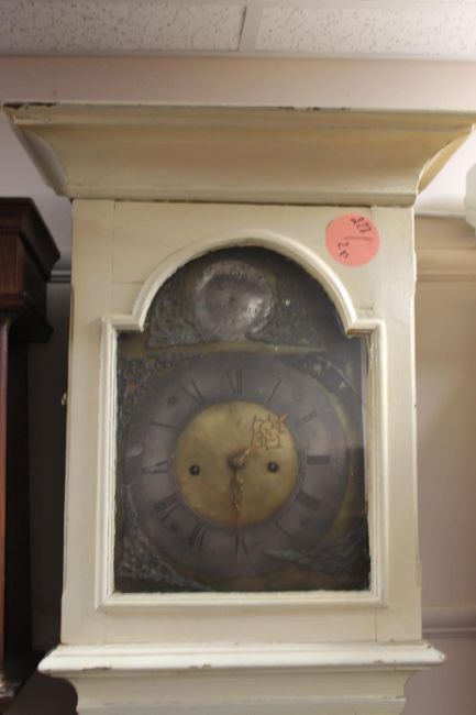 An antique oak longcase clock with brass moonphase dial, pendulum and weights