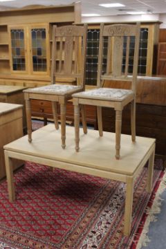 A contemporary oak rectangular coffee table together with pair of carved oak dining chairs