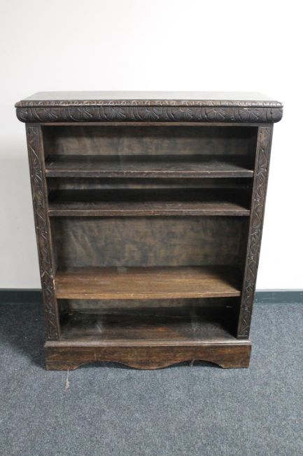 A set of antique carved oak open bookshelves