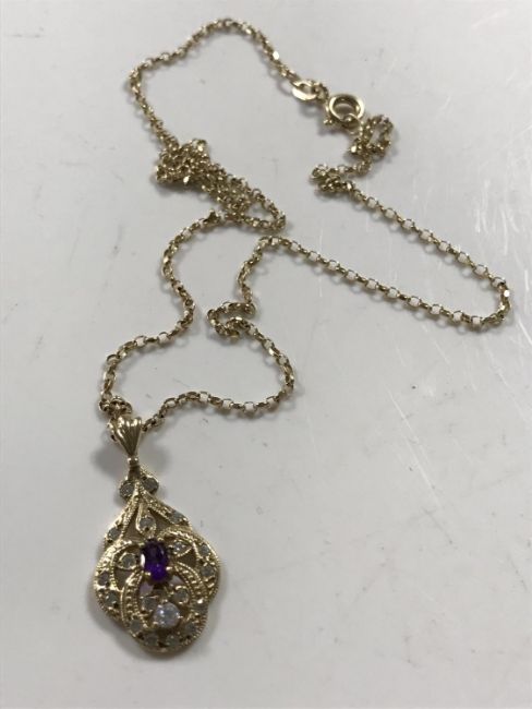 A 9ct gold diamond and amethyst set pendant on 9ct gold chain, 3.7g.