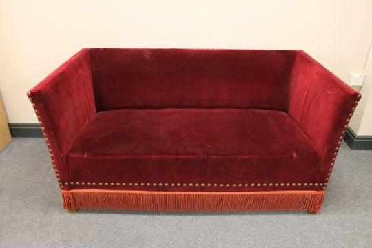 A twentieth century two seater hall settee upholstered in a red dralon