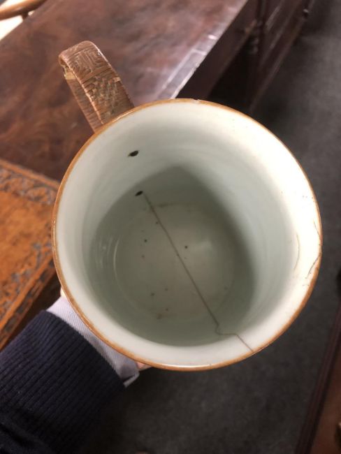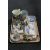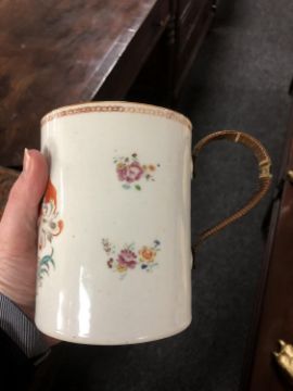 A tray of china including Beswick terrier, china posies, antique creamware tankard, miniature Japanese diorama etc.