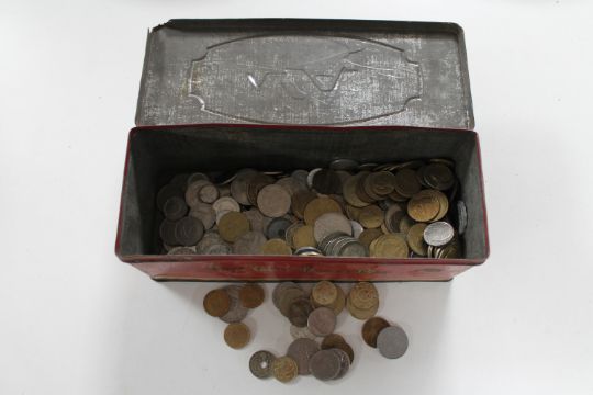 A vintage C.W.F. biscuit tin containing early 20th century and later foreign coins