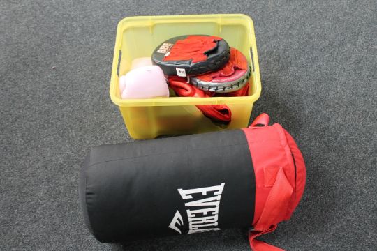 An Everlast punch bag and a box of BBE boxing pads and gloves