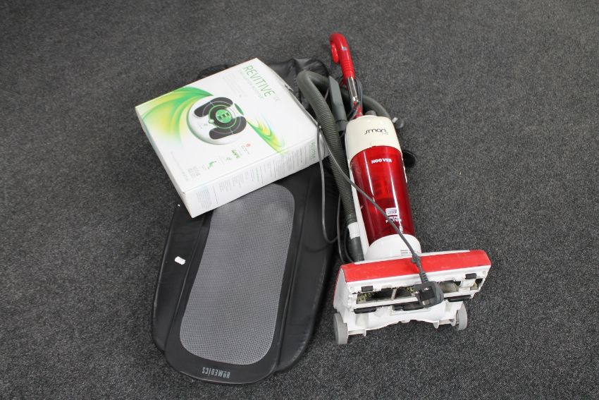 A Hoover pet upright vac cleaner, a circulation booster and a Homedics massage cushion
