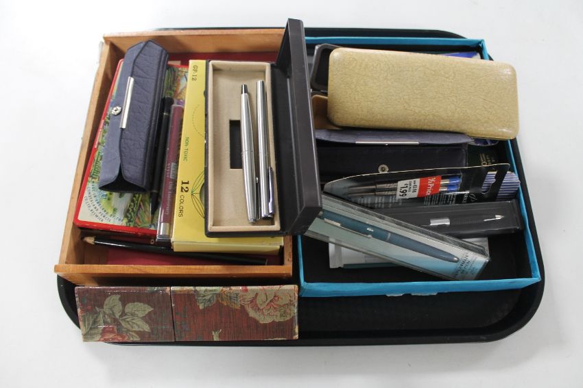 A tray of assorted pens - Parker, Sheaffer, refills, watercolours etc