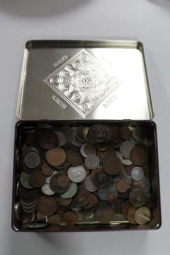 An Ambela confectionary tin containing British George V & VI and foreign coins