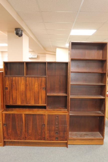 A mid twentieth century wall unit fitted with drawers below together with a set of bookshelves