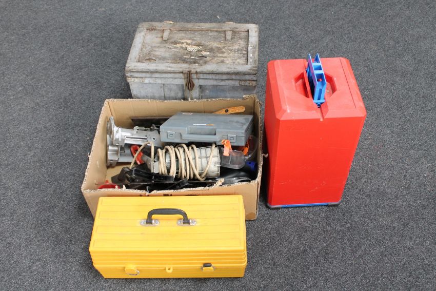 A box, a wooden crate and two further boxes of assorted hand tools, garage light, cased soldering kit etc
