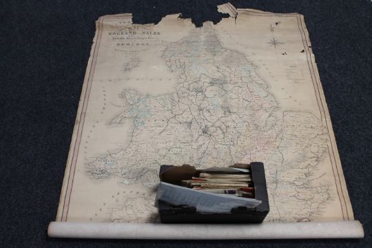 A box of first day covers, maps and a late 19th century school map of England and Wales