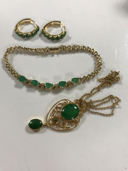 A suite of yellow gold and emerald jewellery comprising of emerald and diamond bracelet in 14ct gold, pair of cabochon cut emerald earrings and 15ct gold pendant mounted with malachite.