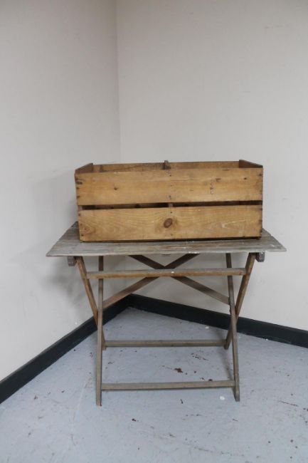 A folding teak garden table and a Jaffa wooden crate
