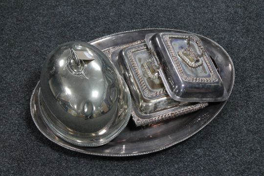 An antique silver plated meat tray together with two silver plated entree dishes with covers and a cloche