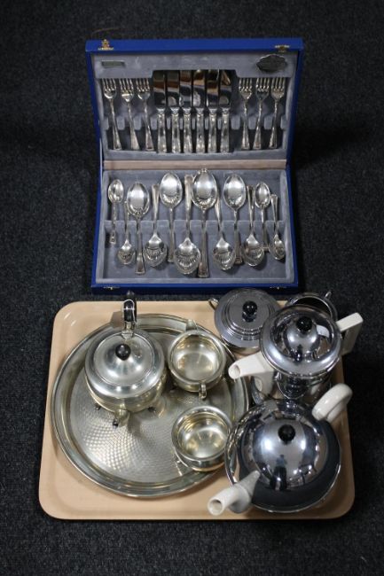 A tray of canteen of plated cutlery, three piece plated Yeoman Plate tea service on tray, four piece chrome tea service