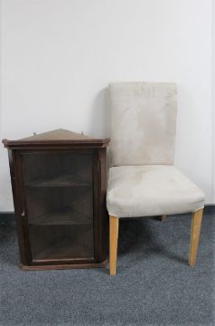 A mahogany glazed door hanging corner cabinet together with a contemporary dining chair