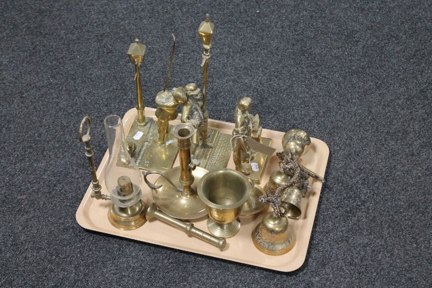 A tray of assorted brass to include three brass figures, lamplighter and blacksmith etc, brass pestle and mortar, candlesticks etc