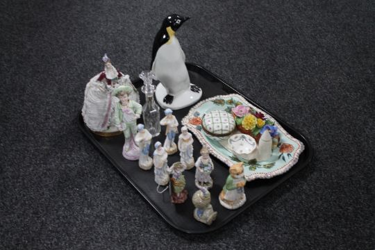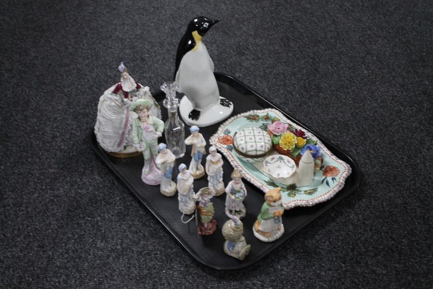 A tray of assorted continental figures, a Beswick Beatrix Potter figure "Ginger", Poole penguin, etc