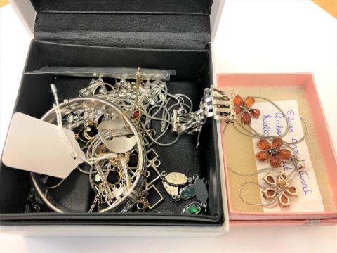 A silver bangle and gate bracelet together with white metal jewellery, costume necklace, amber set jewellery etc.