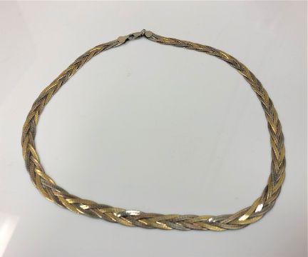 A three tone flat linked necklace, the bale stamped 925, 13.5g.