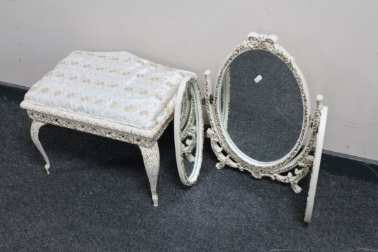 A white and gilt triple dressing table mirror together with a white and gilt upholstered dressing table stool
