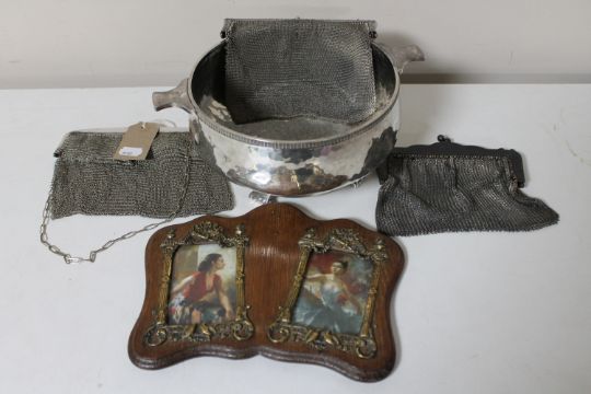 A silver plated Art Deco twin handled bowl together with a Victorian oak photo frame and three chainmail purses