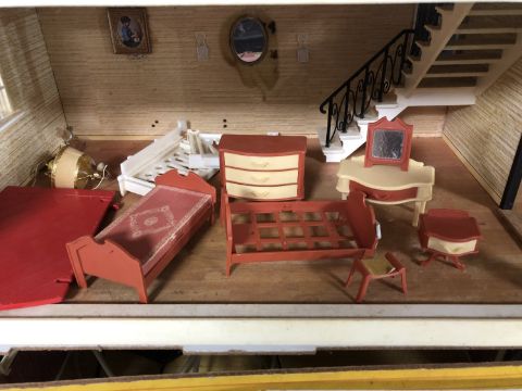 A mid 20th century doll's house together with a metal and wicker doll's pram